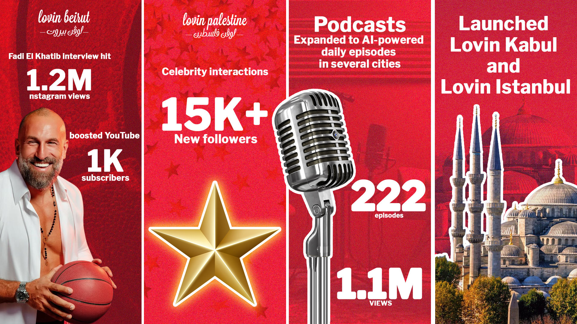 On the audio front, podcasts remained a daily staple for Amman, Bahrain, Beirut, and Doha, with Palestine, Kuwait, and Muscat shifting to daily episodes powered by AI—totaling 222 episodes across cities and reaching 1.1M views. Viral content across platforms included standout posts with 13K likes/200K+ views, 3.9K likes/3M+ views, and 9.2K likes/1M+ views. On the publishing side, the team consistently produced 1–3 AI articles daily, bringing the total to 292 published articles so far. Expanding reach further, Lovin also kick-started Lovin Kabul and Lovin Istanbul, opened up collaborations with new cities, and rolled out story battles across all markets, driving higher engagement.